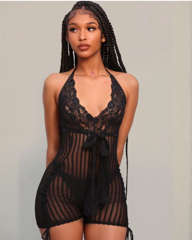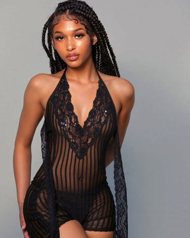 Indulge in timeless elegance with this exquisite handmade black lace striped romper, a true work of art crafted with care and attention to detail. Featuring a sheer, black mesh fabric with striking vertical stripes, this romper offers a chic, form-fitting silhouette that exudes sophistication. The deep V-neckline is adorned with delicate black lace trim, adding a touch of romance and luxury, while the halter-style straps ensure a comfortable, adjustable fit. Long, flowing lace ties at the hips provide a playful, customizable element, perfect for adding movement and a personalized touch.