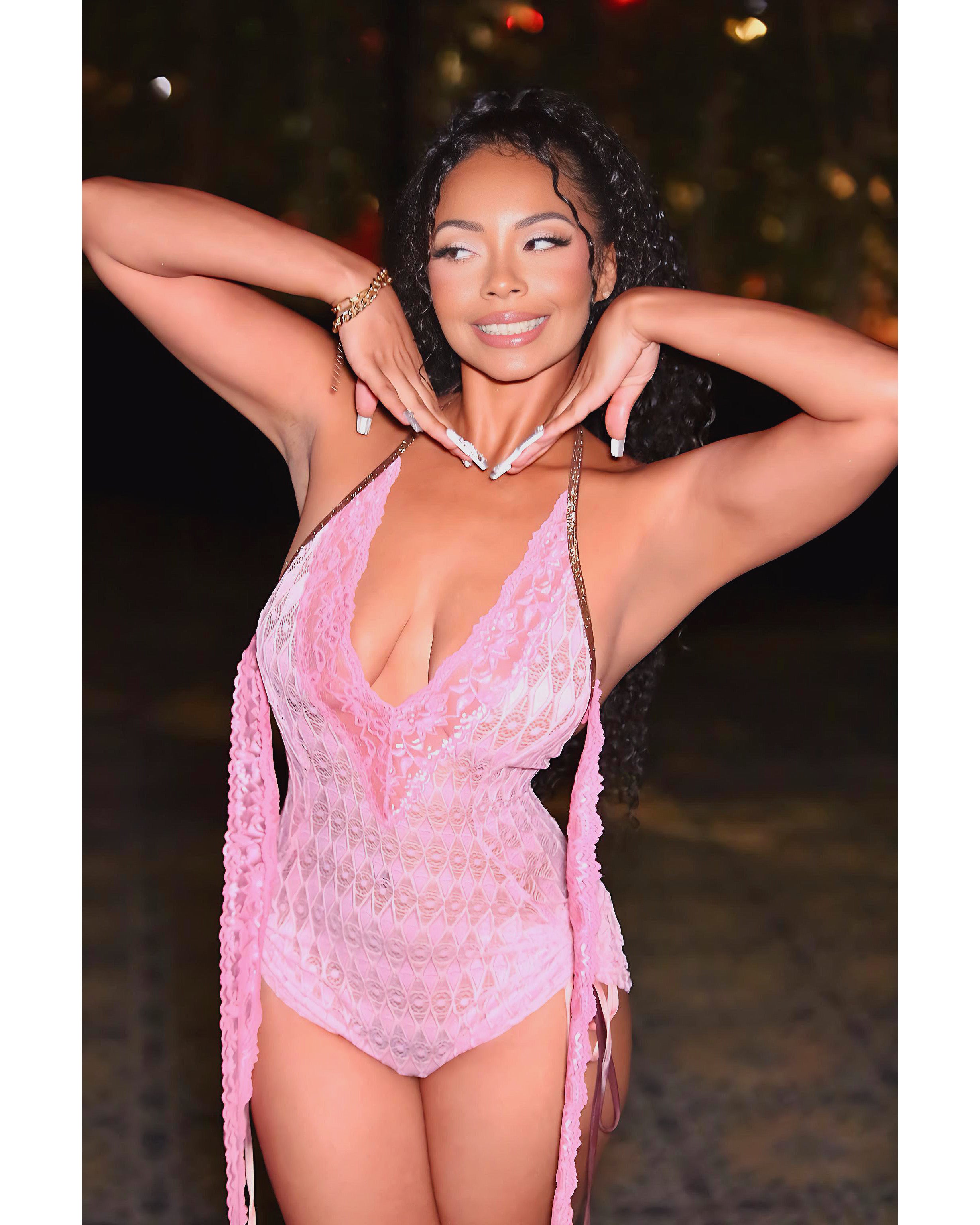 The plunging neckline, open sides, and draped lace panels create a romantic silhouette, while the gold-trim straps add a touch of FacetFine luxury. Lightweight, breathable, and ultra-stretchy, Blush Baby moves with your body whether you’re lounging, traveling, or setting off the room the moment you walk in.