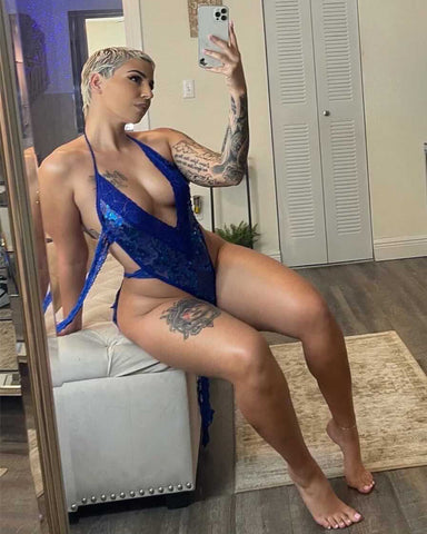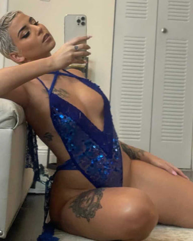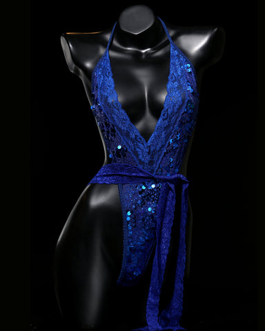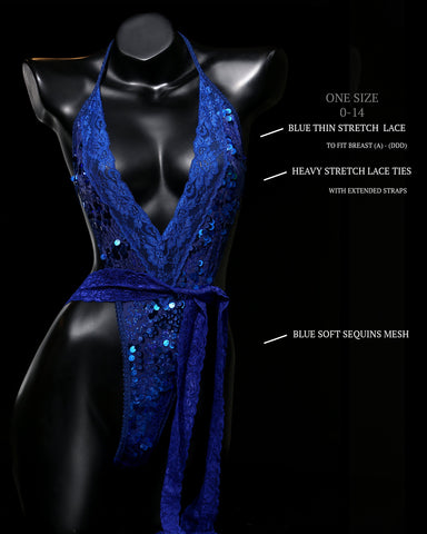 Facet designed BLUE MAGIC Full Body from 4-Way Stretch SAPPHIRE BLUE SEQUIN Fabric and SAPPHIRE BLUE Stretch Double-Side SCALLOPED FLORAL LACE & IRIDESCENT SAPPHIRE BLUE Elastic Spaghetti Straps to enhance all Breast sizes and Body types sizes XS -XL.