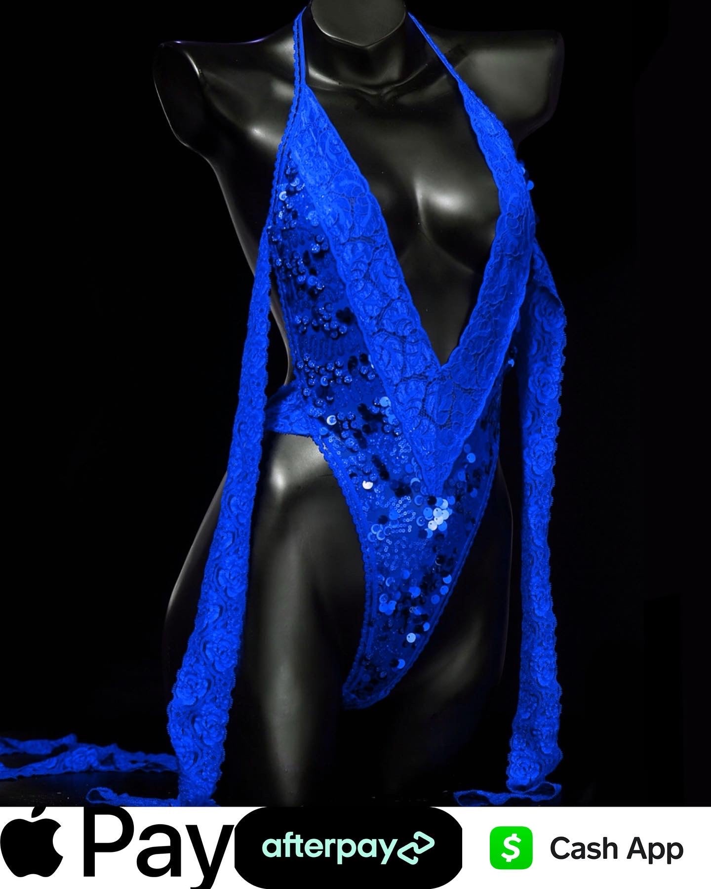 Handmade exclusively from 4-Way Stretch SAPPHIRE BLUE SEQUIN fabric.