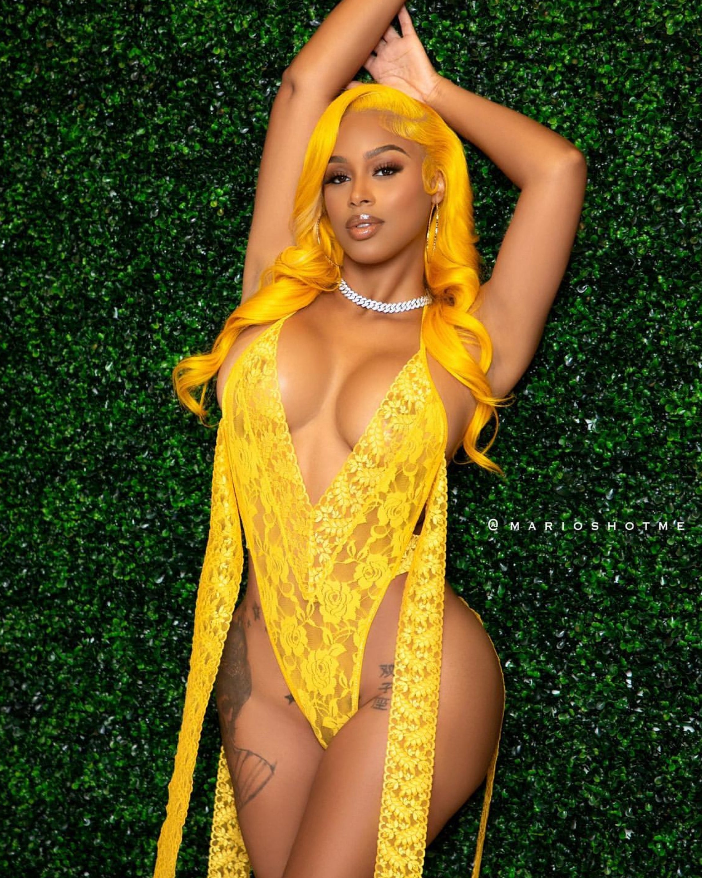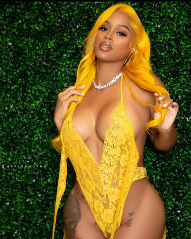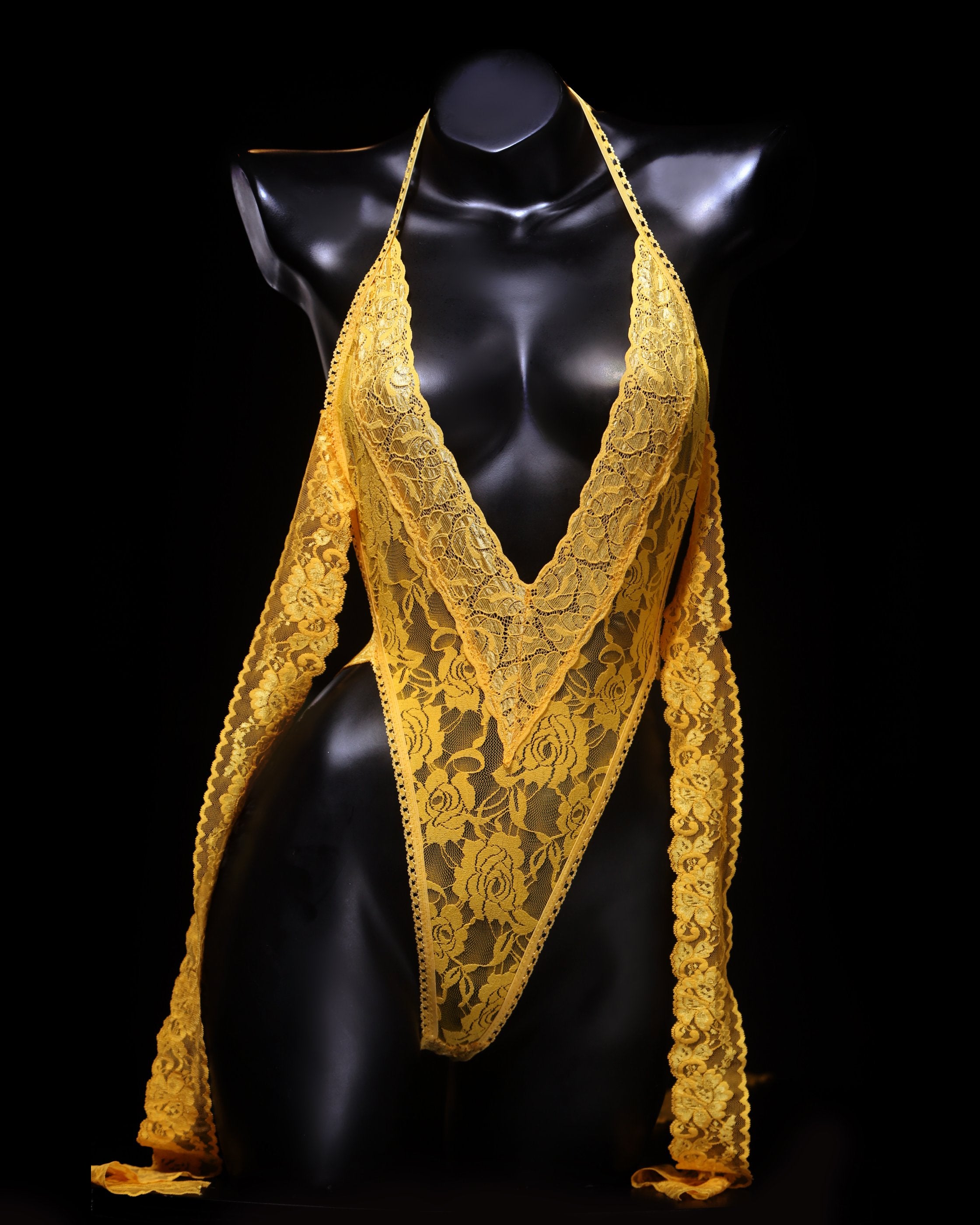 Facet Designed SUN GOD Full Body from YELLOW ROSE FLORAL 4-Way Stretch See-Through MESH, YELLOW Double-Side Stretch SCALLOPED LACE Back Straps, & IRIDESCENT YELLOW Elastic Shoulder Straps Stretch-to-fit sizes 0-18